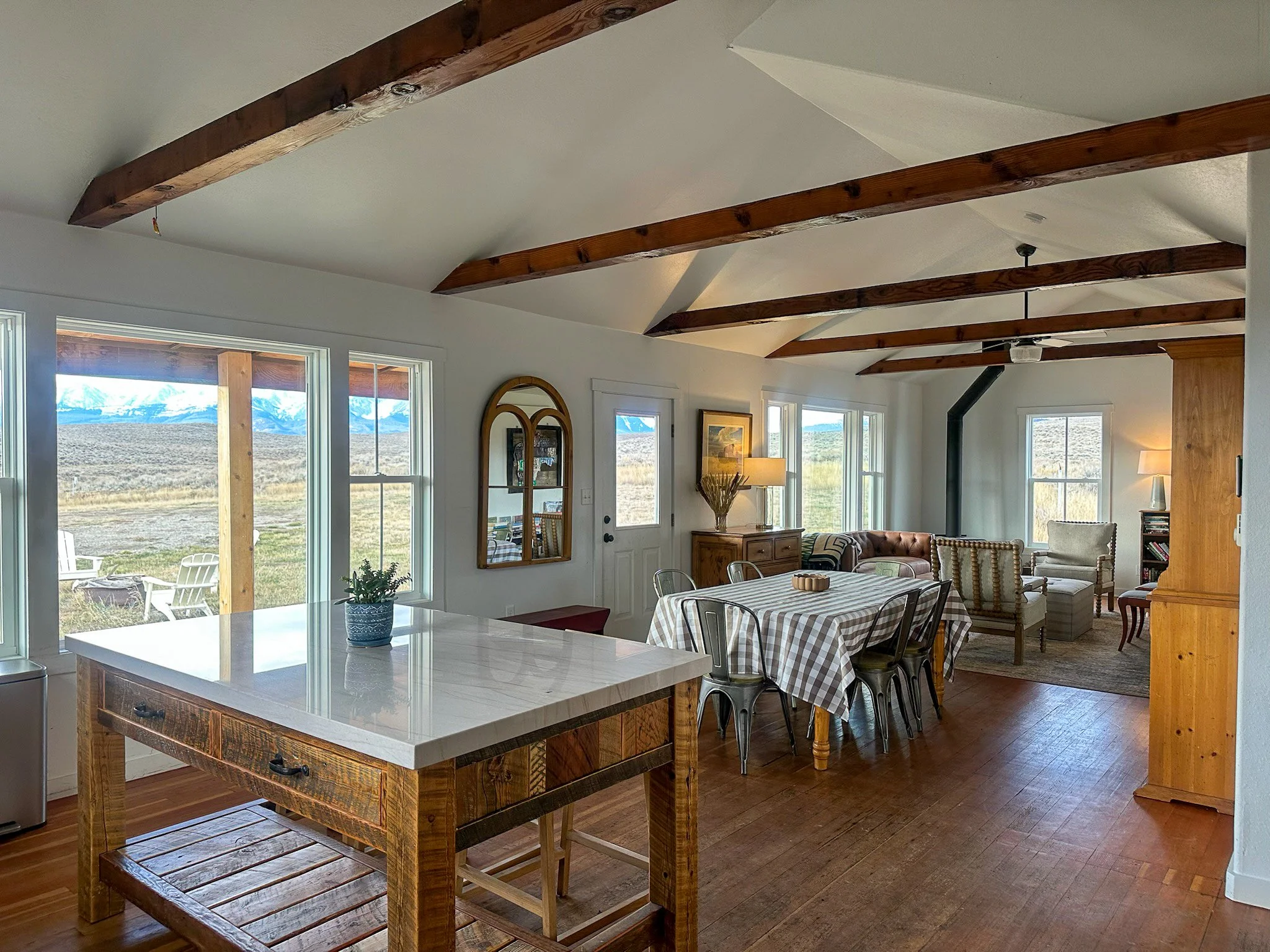 It sleeps up to eight people, is dog-friendly, has all brand-new appliances, a wonderful kitchen, all new windows, two large front porches, two soapstone wood stoves, a private outdoor shower, jaw-dropping mountain views, total privacy, insane star-viewing, and roaming bison as your neighbors.